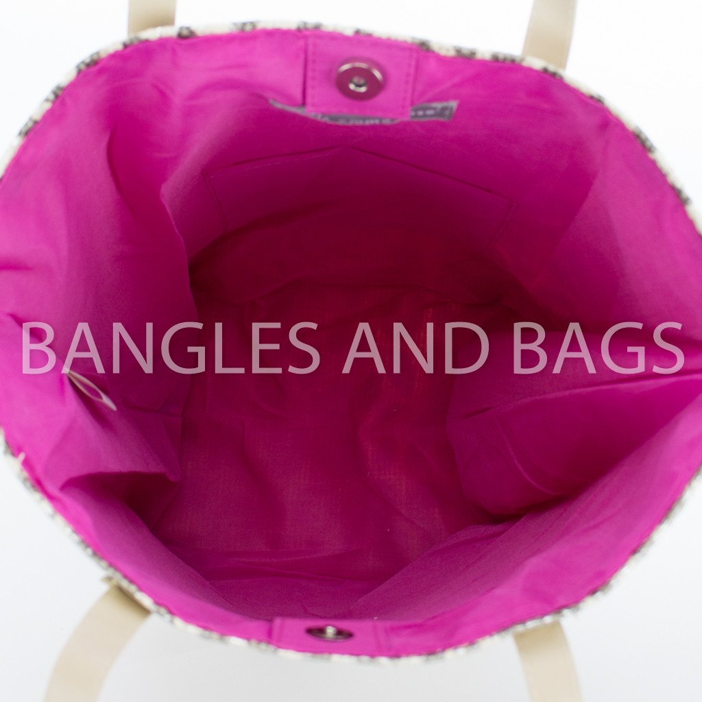 Regular price Sale price Save $16.49This large tote bag is a 14"x15.5"x7" metallic silver and off white tote done in a cheetah pattern. It has a pink lined interior with one open pocket. The tote has brown leather straps and magnetic closure at the top.